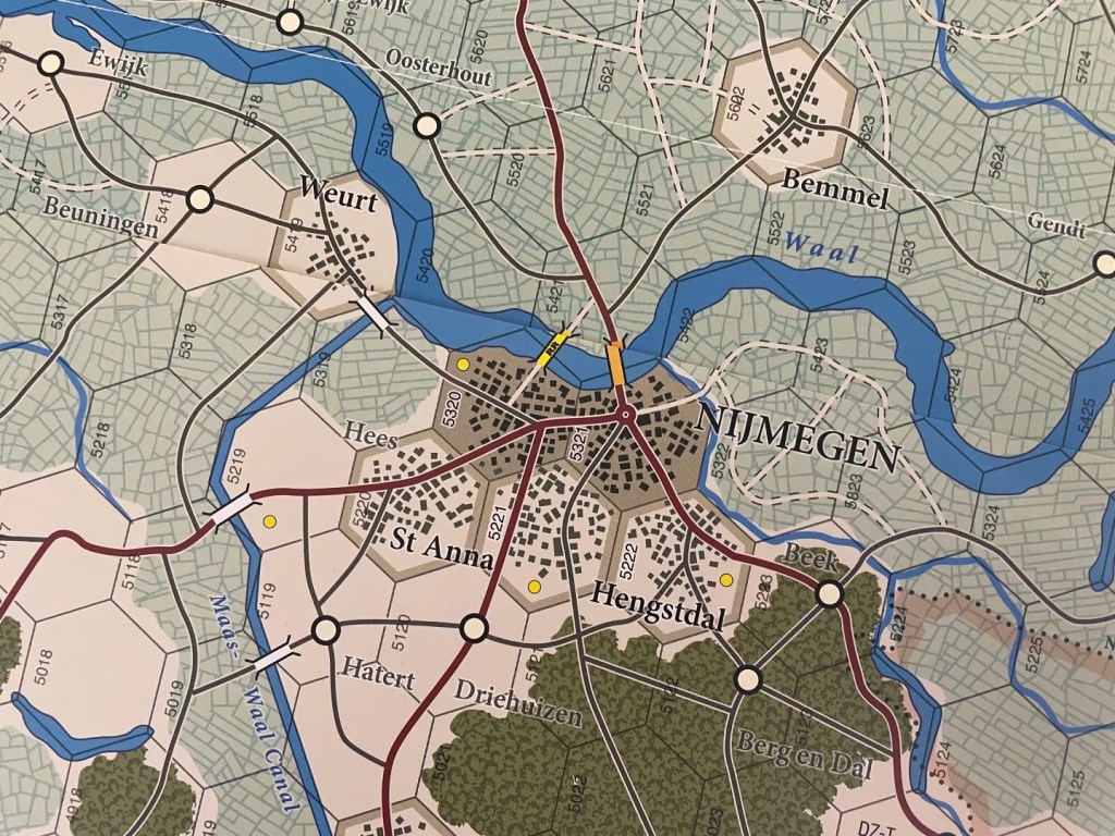 Here is a look at the area around the Eindhoven Bridge from Holland ‘44 from GMT Games, which is one of my favorite games covering Operation Market-Garden. After seeing the bridge in person, these 3 hexes were spot on and represented well what we saw of Eindhoven.