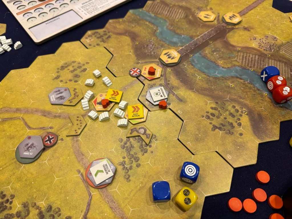 Alexander deftly used his smoke assets to hide his units approach but I was able to eliminate a parachute regiment and reduce an armored car but my Service Personnel got wiped and my Fallschirmjäger attempted some close assaults and was bested. In the end, the Brits crossed the bridge and captured the 2 objective hexes to win the scenario. This game is so good. I love the custom dice and the units cards and the system is just clean and very playable.
