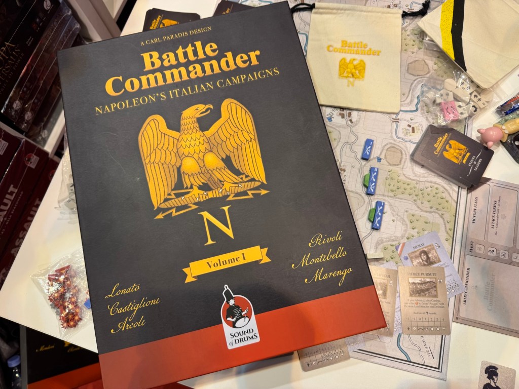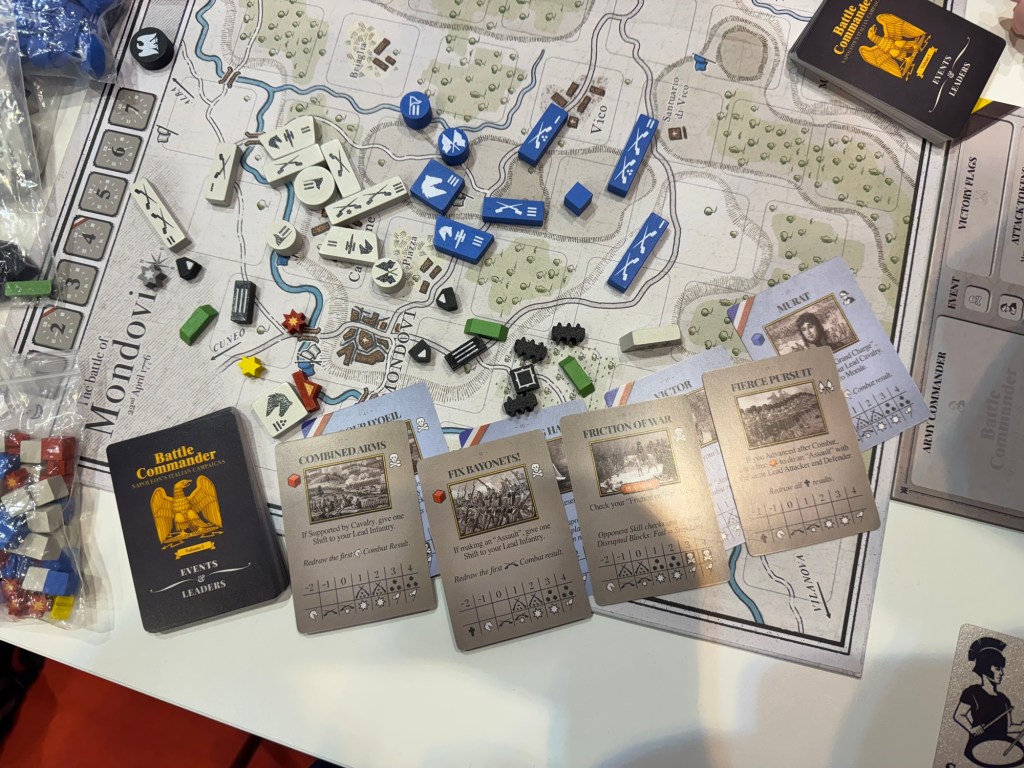 We then got a quick look at the near final production copy of Battle Commander Vol.1 – Napoleon’s Italian Campaigns designed by Carl Paradis. Battle Commander is a new Napoleonics system at Brigade/Division scale, which is very playable, with no downtime or complex computations or mechanics. Game pieces will be painted-on wood blocks of different shapes, so no annoying stickers to apply, you’ll have a couple dozen blocks per side in a game and there are no dice, almost no markers and the emphasis is on the gameplay.