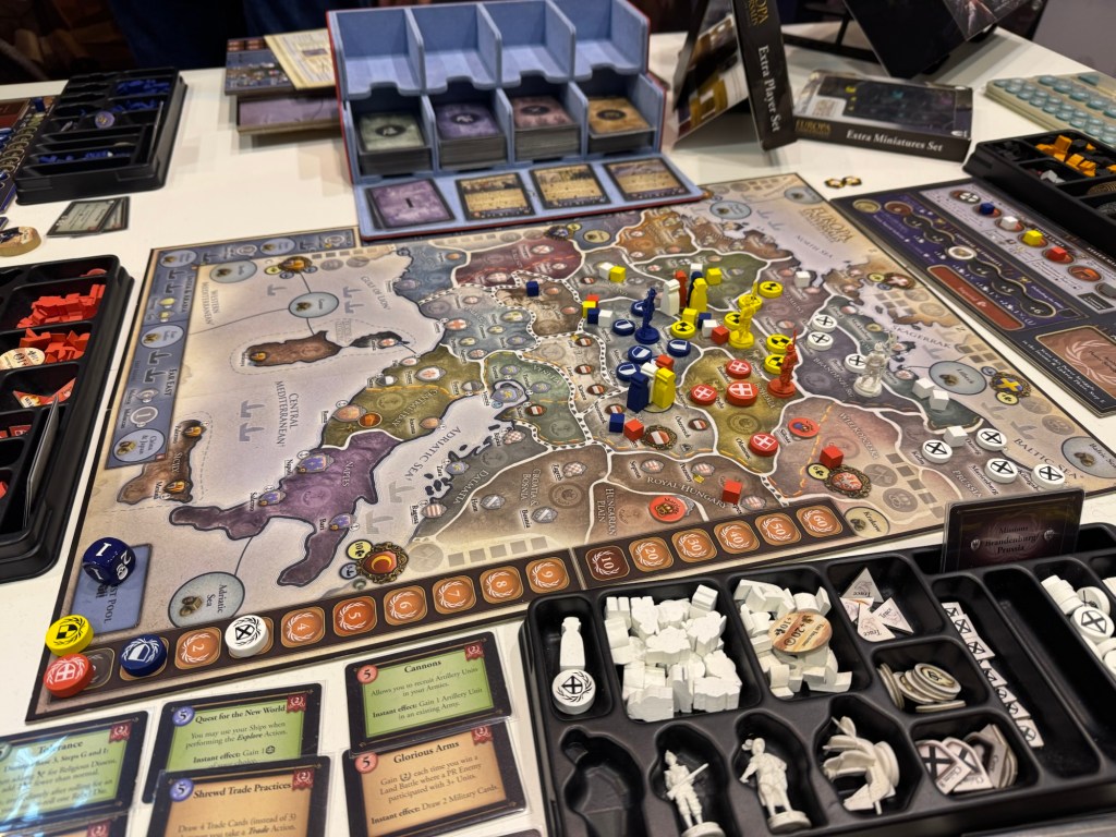 We then were invited by the guys at Aegir Games to play a short demo of the newest expansion to Europa Universalis called Defying Destiny. Defying Destiny adds 240 bridge-sized cards and 156 mini-cards, including tons of new Events and Missions, as well as new Action Cards and Milestones. But the biggest addition is the new board which is smaller and more focused than the initial game we played a few years ago. There are also a bunch of new scenarios which place the nations closer to each other and start the game off with resistance and competition from the start. This was our biggest complaint with the other edition as it just took too long to get to the point we felt tension. This gets it going from the start and is a good change.