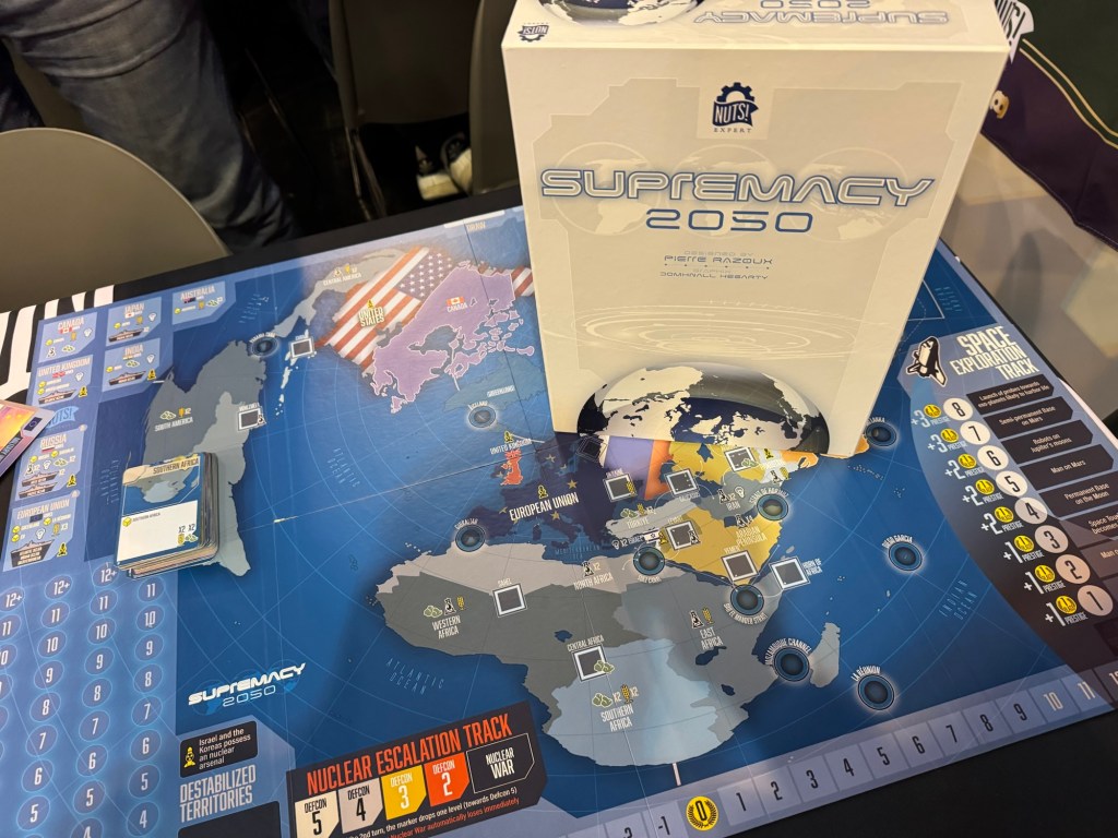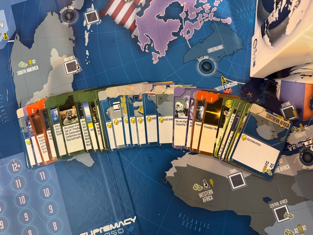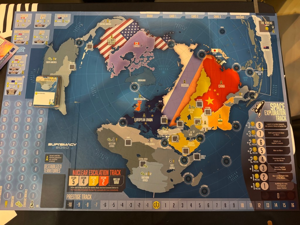 Supremacy 2050 is a geopolitical card driven game that takes a look at the future of world politics designed by Pierre Razoux (FITNA). 1-6 players will compete in international trade for vital resources including strategic materials, oil and grain, and trade commodities on the world market, build armies, navies, nukes and a “star-wars” defense system, borrow money from the World Bank or invest in bonds to increase income.