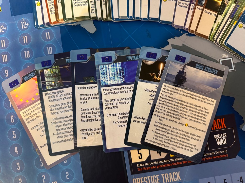 I love the combat mechanic as players play cards from their hands that add the value of the cards to the final combat score from 0-6 but also have events that can do things like bring in reinforcements, retreat before resolution and even move troops on different areas of the board to other areas. Just a very slick combat system that is very uncertain.