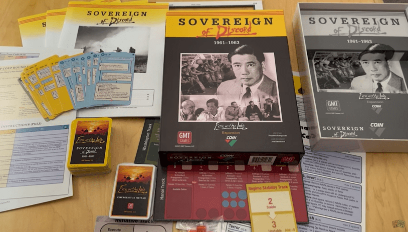 Building off of Mark Herman and Volko Runke’s legendary game Fire in the Lake, the Sovereign of Discord Expansion provides a prequel to the events depicted in the base game, covering the years 1961-1963. The expansion allows players to see how the war escalated from an insurgency between ARVN and Viet Cong, assisted by the US and North Vietnam, to the eventual conventional interventions by North Vietnam and the United States at the start of the base game. New scenarios allow players to extend the game backward to 1961 right after the formation of the Viet Cong, or to 1963 during the tumultuous last year of the Diem regime. Players owning both expansions, Sovereign of Discord and Fall of Saigon, will be able to experience the full Indochina War from 1961 to 1975. This allows players to see how the war evolved from the lower intensity insurgency of the Diem period all the way to the massive conventional offensives of the last years of the war. A copy of Fire in the Lake will be necessary to play the Sovereign of Discord Expansion.
