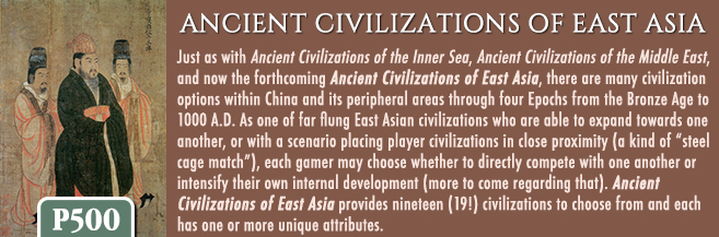 Four Epochs and 19 Civilizations to Choose From (or design your own Civilization). Just as with Ancient Civilizations of the Inner SeaAncient Civilizations of the Middle East, and now the forthcoming Ancient Civilizations of East Asia , there are many civilization options within China and its peripheral areas through four Epochs from the Bronze Age to 1000 A.D. As one of far flung East Asian civilizations who are able to expand towards one another, or with a scenario placing player civilizations in close proximity (a kind of “steel cage match”), each gamer may choose whether to directly compete with one another or intensify their own internal development (more to come regarding that).