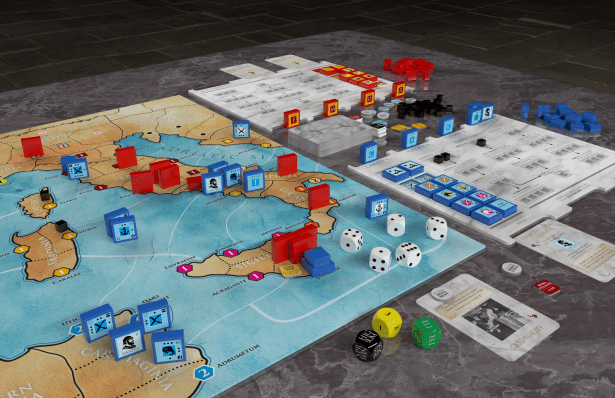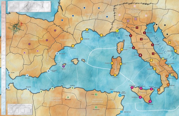 Punicus is a two-player historical strategy game based on the mechanics and concepts of Craig Besinque’s Hellenes, adapted specifically to the theater of the Second Punic War. Cards can be played for their Events or to generate Action Points used to recruit new unit blocks and maneuver armies across the map to engage in battle and besiege enemy cities. In addition to these core systems, players will engage in new actions such as piracy and diplomacy, and manage special projects on their player boards that shape the strategic development of their side.