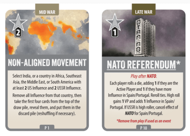 Finally, we got a look at some card samples of the Turn Zero cards from Twilight Struggle 20th Anniversary Hall of Fame Edition. Here are two of the promo cards from the upcoming Twilight Struggle 20th Anniversary Hall of Fame Edition! Non-Aligned Movement is one of the cards from the Promo Packs, now updated for the 20th Anniversary edition. At times, the Non-Aligned Movement opposed both nuclear powers, and the card reflects this with it’s neutral alignment. NATO Referendum is an English language version of the Referéndum OTAN promo card from the Spanish Language version of Twilight Struggle, thanks to Devir Games. Now you can resolve the 1986 Spanish NATO Referendum in your games of Twilight Struggle.