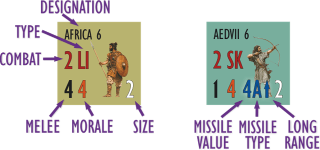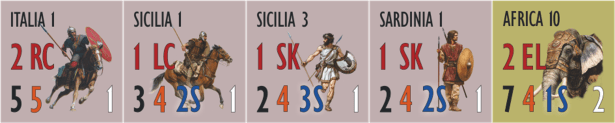 Fabrizio: Each unit has a Size, typically going from 1 to 4. For land units, each Size point represents 500 infantry or 200 – 300 horsemen. A typical Roman legion has 5 counters, with each counter representing two cohorts (approximately 1,000 men); A naval unit represents a mix of triremes and transport ships, with each Size point having 10 combat ships.