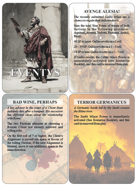 Avenge Alesia: This card may trigger a Revolt in the recently conquered Gallia. The Gallic tribes were mostly subdued by the start of the Civil War, but they were far from having accepted the Roman domination, as stated by the fact that Caesar always left a garrison of at least three Legions plus Auxiliary Troops. If given a solid chance, some Gallic tribes could have revolted again.