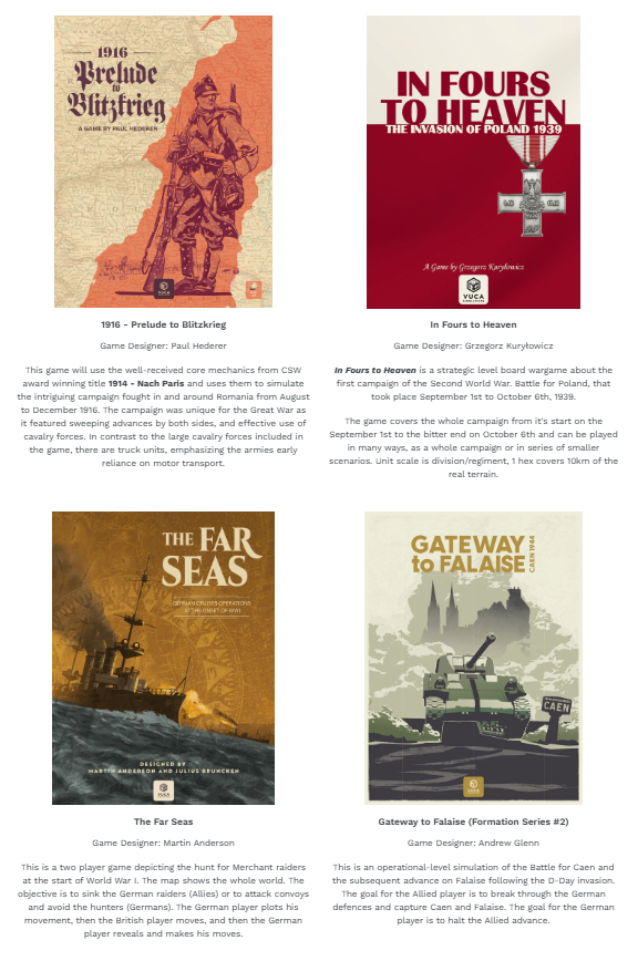 This batch has 4 really interesting titles including 1916 – Prelude to Blitzkrieg (game will use the well-received core mechanics from CSW award winning title 1914 – Nach Paris and uses them to simulate the intriguing campaign fought in and around Romania from August to December 1916), In Fours to Heaven: The Invasion of Poland 1939 (strategic level wargame about the first campaign of the Second World War the Battle for Poland), The Far Seas: German Cruiser Operations at the Onset of WWI (the hunt for Merchant raiders at the start of World War I) and Gateway to Falaise – Caen 1944 (operational-level simulation of the Battle for Caen and the subsequent advance on Falaise following the D-Day invasion). There is a further description on each of these titles on the site and I am very much interested in all 4 of these games.
