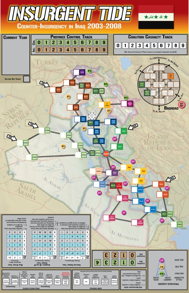 Insurgent Tide: Counterinsurgency in Iraq, 2003-2008 is a 2-player operational/strategic level game covering the Coalition’s counterinsurgency effort in Iraq from 2003-2008. Each year is a turn, but is composed of alternating card plays between players. Units range in size from Multinational Divisions down to Insurgent cells.