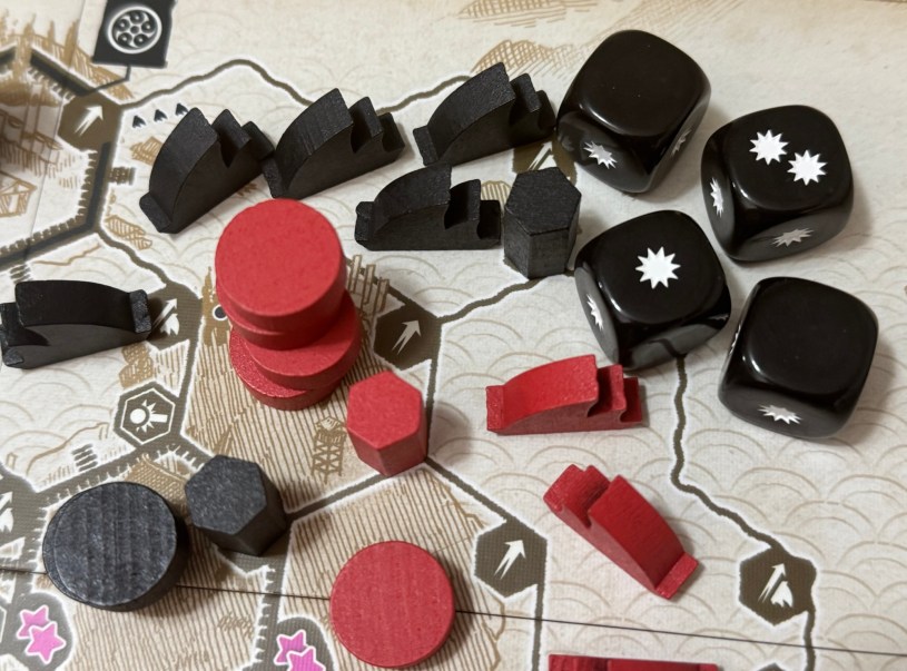 As briefly mentioned earlier, the game involves deploying Commanders in the form of hexagonal shaped cylinders onto the board in order to control objectives but also to use actions that are printed in the spaces in order to advance on territories, bombard enemy units and control the various waterways on the board. Supply lines are very important in the game as you cannot control an area unless you can trace a line back to other friendly territories and your capital but don’t bog the game down with complex rules. There are a few new additions to the system in the form of ships and their control of waterways as well as special siege engines that are used when assaulting castles and the game was very fresh and interesting.