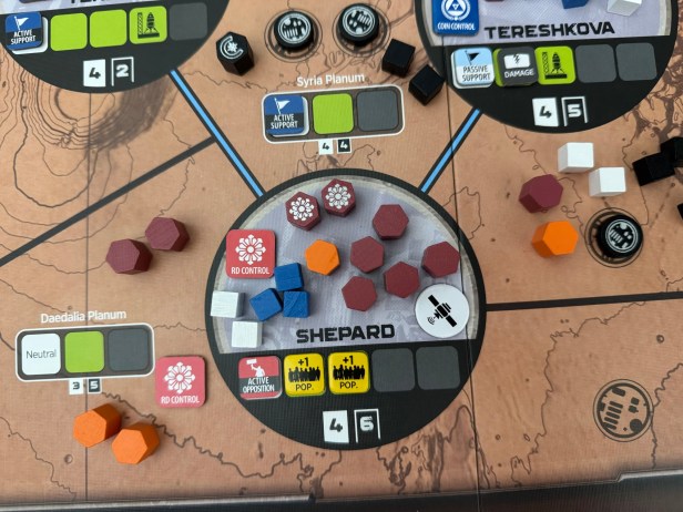 The Red Dust faction are native-born Martian workers who form the backbone of the Red Dust (RD) Movement. The so-called “Dusters” demand a government for Martians, by Martians, without Earth interference, and they are willing to take it by force. Nominally a worker’s movement, the Dusters are an organized and determined force within the labyrinths of Mars and must rally the unions, guilds, and various popular assemblies to their cause to force the Earthers out and secure a free Mars for Martians. This effort involves the action of Campaigning to rally support in the form of Opposition to Earth interference and the Martian government. The Red Dust faction wins the game by a calculation of the Total Opposition plus their Bases found on the board and this requires them to build up their forces in the urban centers such as Shephard, Tereshkova, Europa and Tenzing. Once built up, they can take the Campaign action which will bolster Opposition and can cause rioting or other ongoing effects.