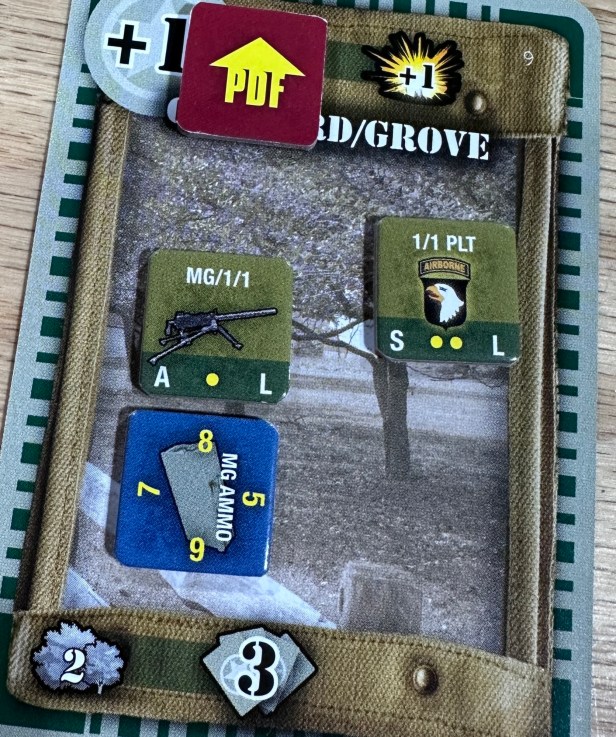 In Fields of Fire, ammunition management is a key element of the simulation for specific heavy and special weapons such as Light Machine Guns (LMG’s) and Heavy Machine Guns (HMG’2). Ammunition is tracked and units with limited ammo must expend an ammo point whenever they fire. This ammunition it tracked on a counter placed near the team on the card they reside on and at maximum loadout the counter has 8 rounds of MG Ammo. Only certain weapons have individually tracked ammunition, primarily heavy weapons and one-shot devices. Standard rifle squads, for instance, generally have an abstract, unlimited supply of small-arms ammunition. When a unit runs out of ammunition for its special weapon, it is marked as Out of Ammo (S-C, or Supply-Concern) on the counter and can no longer use that specific weapon. The concept of resupply is handled abstractly, often through specific mission rules or Higher Headquarters Events. For example, some missions may state that all machine guns are resupplied at a certain turn, which involves removing the Out of Ammo marker. Ammunition can also be represented by specific ammo markers that are transported around the battlefield. I really like this level of granularity in the game as it makes it feel more like a simulation and really gets the player into the mindset of asset and team management.