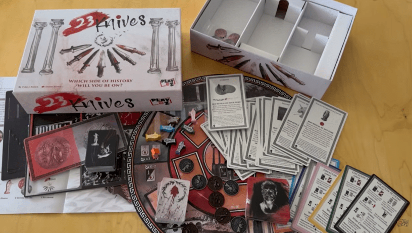 In 23 Knives, players take on the role of a Roman citizen with one of three allegiances: a loyalist to Caesar, a liberator of Rome, or an opportunist biding their time. Throughout the game, you travel through Rome, manipulating other citizens and swaying them to your cause. At the end of the game, if 23 or more knives are in the Curia, Caesar is dead and the liberator most committed to killing Caesar wins. With fewer than 23 knives, the loyalist most dedicated to saving Caesar wins. Opportunists are those who linger, waiting to shift the fate of Caesar at the last moment, and if they do, they win as a team.
