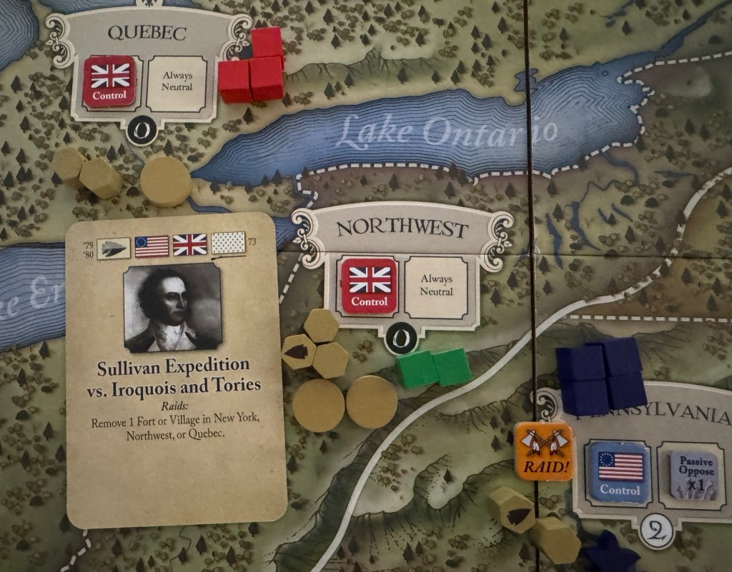 The Sullivan Expedition card in Liberty or Death is one that has the exact same effect for all sides; that of being used to remove either a Fort (if being played by the British/Indian side) or a Village (if being played by the Continental/French alliance). Actually, either side can use the card to remove a Fort and I have found that this is how it is mostly used but the power of removing one of these 2 items cannot be minimized. Normally, during battles, the last removed pieces in a space are the Forts or Villages as attackers must defeat all present pieces to remove their fortified locations. This can take multiple attacks and see lots of actions and resources invested into it when this simple card can do that work in one fell swoop. I have said this before but the really great part of these Card Assisted (or Card Driven) games is that rules can be broken or ignored by the play of certain cards and Sullivan Expedition is one of these rule breaking/bending cards. The card is tied to the history of the conflict and can only be used in 1 of 3 locations being either New York, Northwest or Quebec. These are areas where the Indian faction typically builds up their Villages as this is one of their Victory Conditions being the number of Villages that Indians have on the board as compared to the Patriot Forts. This is not a straight numerical comparison of the 2 sides total but involves some math. Not hard math but math nonetheless. The Victory Condition is actually Indian Villages (the tan discs) less 3 is greater than Patriot Forts. So, let’s say the Indian player has 7 Villages on the board and the Patriot player has just 3 Forts. The mathematical formula would be 7 – 3 = 4 > 3. This would equate to this part of the Victory Condition being met for the Indians. But, the designer and development team made it so you don’t have to do math. There is no great need to calculate the “+3” mathematically since the Indian Villages and Patriot Forts tracks on the map do it for you visually. The Forts Track is offset by 3 holding “boxes” (circles/stars) compared to the Villages track, so if the “lowest” (or “south-most”, or whatever you want to call it) empty Village circle on the Village track is “below” (or “south of”) the lowest empty Fort star on the Forts track the Indians are ahead in their victory condition.