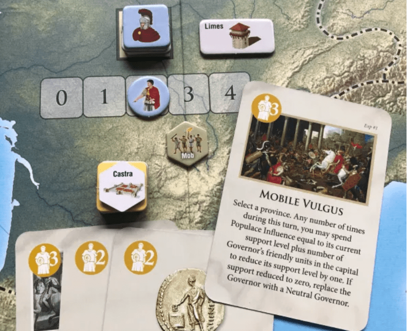 I really love Time of Crisis from GMT Games. This is a very light, introductory wargame that is just plain fun to play. I have been playing it a ton on the Rally the Troops! online platform and really enjoy it no matter what the outcome of those games are. One card that I enjoy using is called Mobile Vulgus, which is a 3 value Populace Card that really can be a devious way to usurp your enemies. This card was added to the game in The Age of Iron and Rust Expansion and is one of those cards that is very situational but very good.