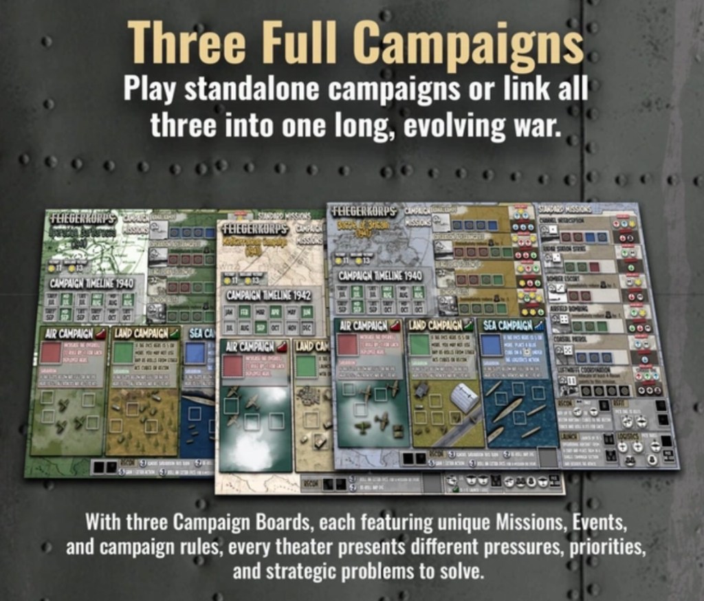 Martin; I wanted this game to lean heavily into the simulation aspects of controlling an air corps in WWII and leave out much of the unit tactics involved in battles. Several key elements needed to be represented in the design were aircraft rotation between the Operational and Refit rows, logistical limitations, and escalating enemy pressure tracked through the Air, Land, and Sea Campaign Dice. I also wanted the game to reflect the reality that these campaigns were multi-domain efforts. Air operations rarely existed in isolation, they influenced and were influenced by events on land and at sea. It was important for me that the player could meaningfully affect the larger campaign across all three theaters: Air, Land, and Sea.