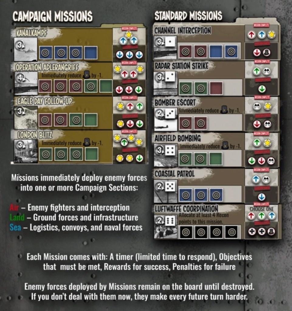 Usually Missions are generated by rolling a 1D6 on the Standard Mission table for routine ops like fighter sweeps or convoy strikes and deploy enemy cubes in the section. However, if you land on a green spot on the Timeline? You Skip the roll and generate a Campaign Mission with bigger risks, but juicier rewards. Campaign Missions are unique, historical operations like the London Blitz or the Encirclement of Kiev.