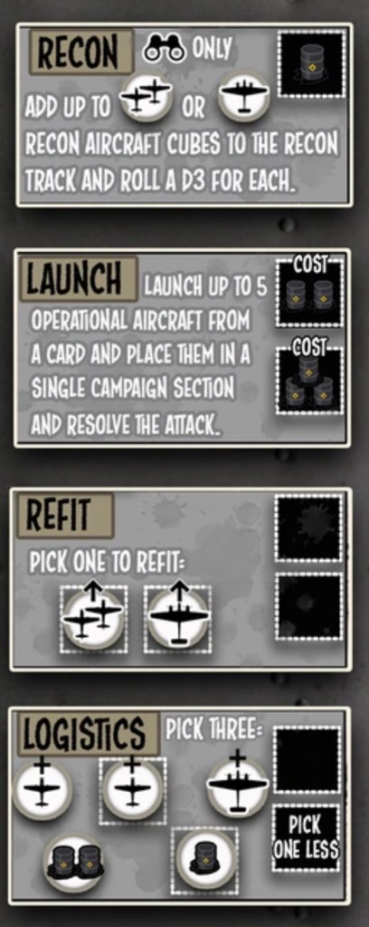 Launch/Attack: Launch aircraft from the Operational Row of one Aircraft card to target a Campaign Section. Successful rolls remove enemy cubes, which may be placed on Mission objectives if possible. After resolving the attack, those squadrons move to the Refit Row.
