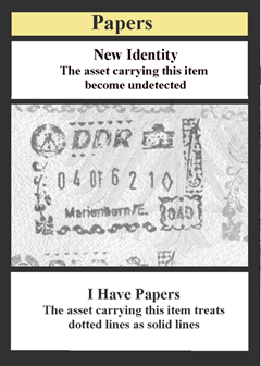 Next let’s look at the Papers card, arguably one of the most important items in the game. This card will only appear on missions that include the Papers item marker. If a detected asset has picked up this item and is carrying it, playing this card can make them undetected. For some missions, the active effect at the bottom of this card is even more important. Dotted travel lines on the map cross over the Berlin Wall and assets normally can’t traverse them, but while this card is showing in the draw area, an asset carrying this item can cross into East Berlin, or back.