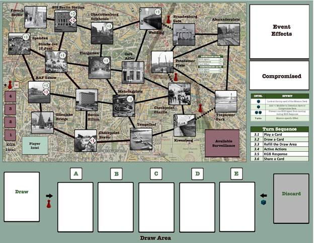 Russell: First, I need to point out that this is all just my own prototype artwork for playtesting. The two most important areas on the board are the map of Berlin and the card draw area. The map is roughly a five by four grid of iconic locations connected by travel lines. It’s made up of sixteen locations in West Berlin and four in East Berlin, on the other side of the Berlin Wall. The player’s assets will move around this map, gathering intel, interacting with items and other assets to complete the mission, and hopefully avoiding detection. The KGB agents also move around this map and are the players’ primary adversaries. Below the map is the card draw area, a row of five face-up cards representing locations, items or assets. Above each card location is a spot for a chit representing one of the moving tokens on the map – the assets and KGB agents. The draw area is the core mechanic of the game, determining where assets and KGB agents move, where surveillance and intel cubes are placed, and even where some historical events take place. In addition to these two areas, the board also contains locations for intel collected by either side, as well as unused surveillance pawns available to the KGB.