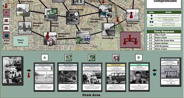 Russell: Good question. Players will feel, with good reason, that the most important decision they make each turn is which of the two cards they take from the draw area. That decision effects so many parts of the game, and often involves making difficult tradeoffs. But players also make many other decisions each turn. When assets and KGB agents move, they often have a choice of two destination locations, and the player can usually decide between them. The player also must decide which card to play at the start of their turn, and this can significantly impact the outcome of everything that follows. The player can spend Intel cubes to look ahead at the next card, or to improve the odds of a detection save. They decide when an asset picks up or drops an item. In a multi-player game, they choose cards to add to the shared hand and decide when it’s necessary to call a secret meeting.