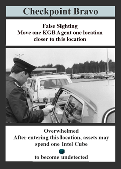 Russell: Certainly. Let’s start with the location card for Checkpoint Bravo. On the map you’ll find the Checkpoint Bravo location at the bottom left. In reality, this was the main entry point for road traffic coming into West Berlin from West Germany, and it was actually a much busier crossing than Checkpoint Charlie. The name and the image on the card make it easy to match it to its corresponding location on the map. At the top of the card is the played effect. This is what happens when the player plays the card at the start of their turn, and it generally isn’t optional. At the bottom of the card is another printed effect. This is the active effect and applies as long as the card is showing in the draw area. The Checkpoint Bravo card is actually quite powerful. It moves a KGB Agent of the player’s choice one location closer to Checkpoint Bravo. The active effect of this card is very good, as well. As long as the card is showing in the draw area, the player may spend an intel cube to make a detected asset entering Checkpoint Bravo become undetected.