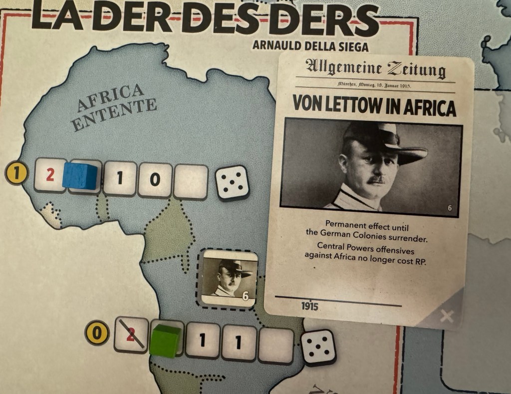 I mentioned the characters that are introduced by Event Cards and one of my favorite is the Von Lettow in Africa Event Card. This card refers to Paul von Lettow-Vorbeck who was a German General who commanded the Schutztruppe (colonial forces) in East Africa. Leading a small force of 3,000 Germans and 11,000 African Askari, he fought a brilliant guerrilla campaign against superior Allied forces (up to 300,000 men), never losing a battle and surrendering only after the 1918 armistice. The effects of this Event are that any Offensives by the Central Powers undertaken in Africa will not cost any Resource Points. This card will not appear until 1915 but can be a real boon to the CP player as they can continue hammering on the African Entente trying to get them to Collapse and no longer contribute their Production Value to the Entente war effort.