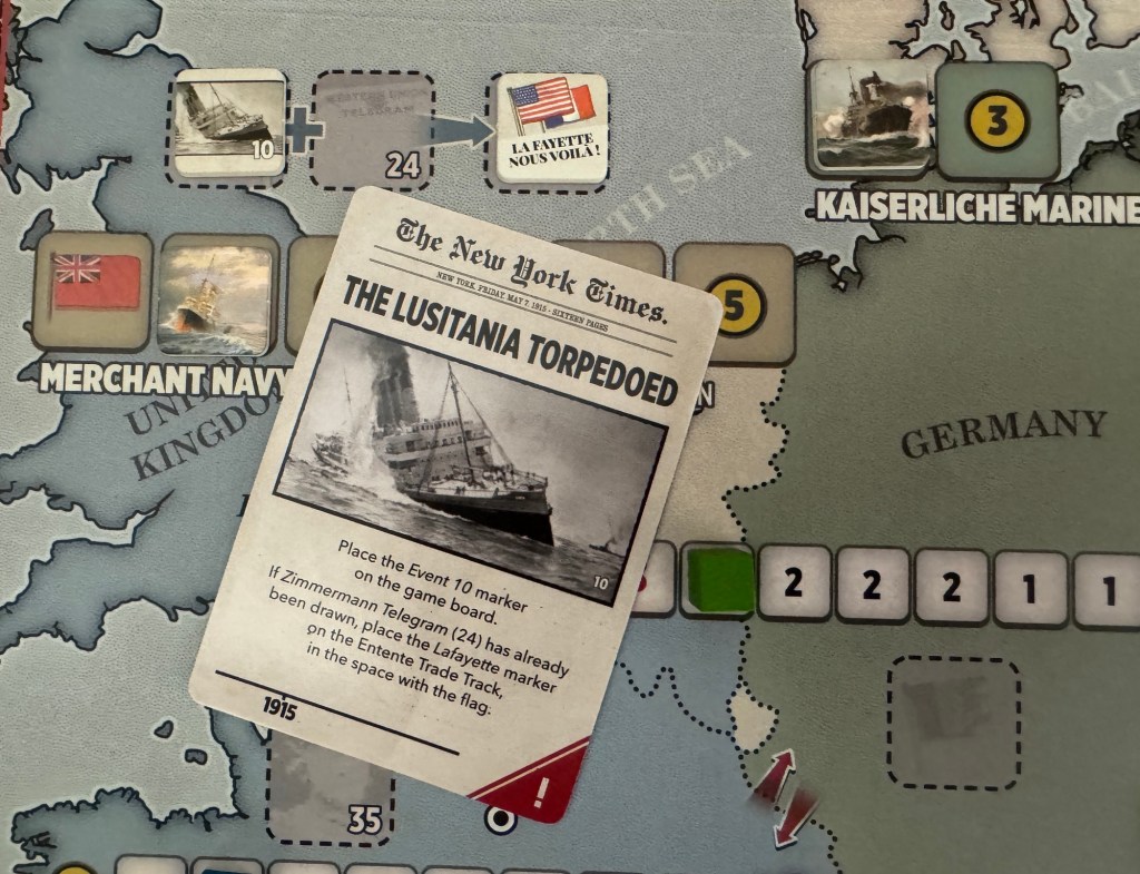 One of the major events that are covered by the Event Cards include the likes of the sinking of the Lusitania by the German U-Boats. On May 7, 1915, a German U-Boat torpedoed and sank the British ocean liner RMS Lusitania off the Irish coast. The ship sank in just 18–20 minutes, killing 1,198 of the 1,959 people on board, including 128 Americans. The attack spurred international outrage and shifted U.S. public opinion against Germany, contributing to the eventual American entry into the war. The effects of the is card include the placement of the Lafayette Marker above the Merchant Navy Track and indicates the number of additional Resource Points awarded to the Entente for the current turn. This support was basically from the United States of America as their citizens were killed in the tragedy and can be a very tough pill to swallow for the Central Powers as it is a death knell due to additional resources to bring more troops and focus more attention on Technology and the launching of Offensives.