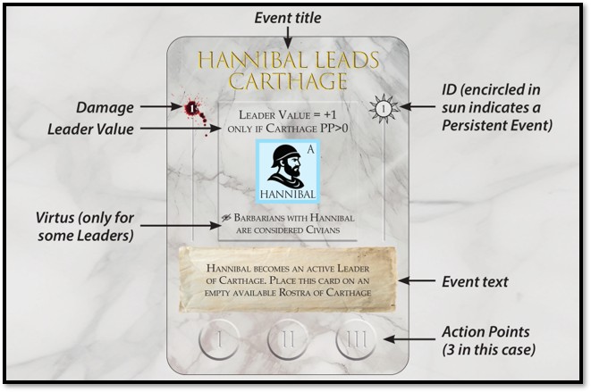 Carlos: Yes, of course. Here is the “Hannibal Leads Carthage” Card and its key features. This card starts on the Carthaginian player board. It is a Leader card: while it remains on the player board, it grants its player its Leader Value (additional Action Points) and also gives Hannibal’s block a Virtus, or special ability—in this case, it means that any Barbarians with him do not dissolve in Winter. You can also see a value labeled Damage. When a unit crosses a mountain border, or a Fleet runs into a storm, you draw a card to see whether it takes damage.
