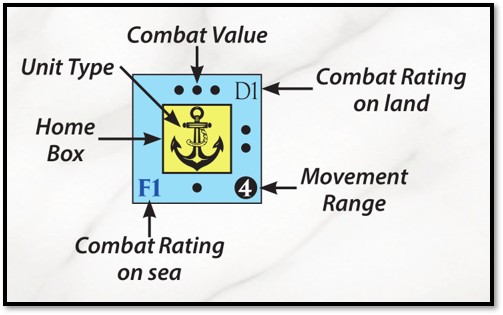 Carlos: The units are essentially wooden blocks with stickers. In short, the sticker shows the unit type (infantry, auxilia, cavalry, etc.); its Combat Value (the number of dice it rolls in combat); its Combat Rating, which determines when it attacks (in alphabetical order) and what it hits on or uses to cause routs; its Movement Rating; and, very importantly, its Home Box, which tells you where that unit can be recruited.