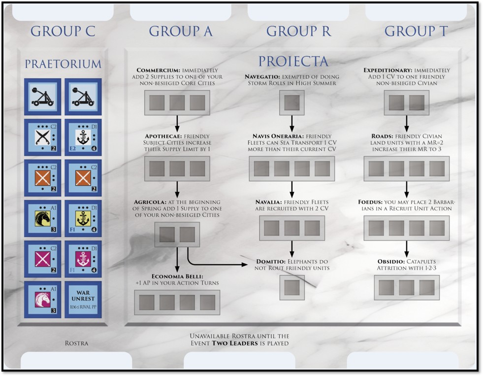 Carlos: The player boards are dual-layer boards, so units and Supply cubes can sit neatly recessed in place. Each player board has a Praetorium, an area that holds units the player cannot recruit at the start of the game; these units will enter play later through Diplomacy Actions or Events. There is also the Proiecta section, where players invest and accumulate Supply cubes while researching projects. At the top, there are slots to hold groups of blocks in case the stack becomes too large to keep on the main map. At the bottom of the player board are the Rostra, where each side places the cards of its active leaders.