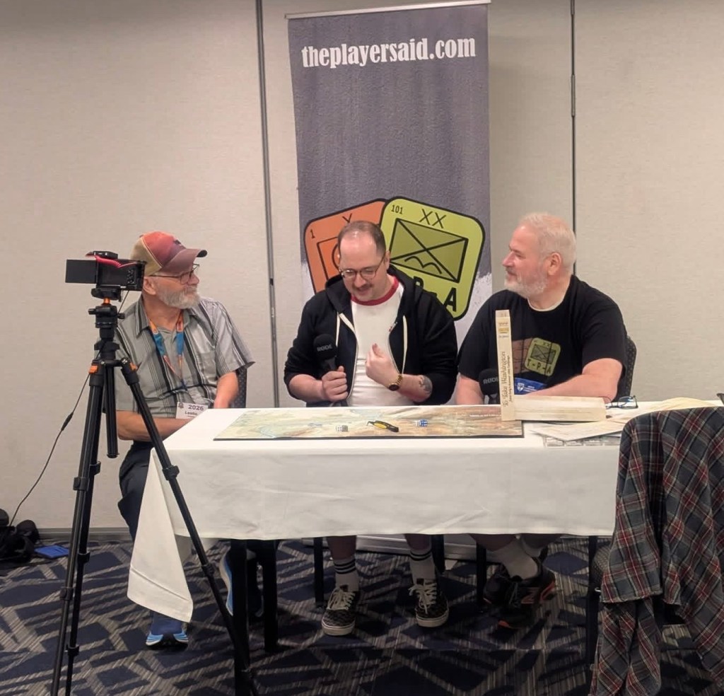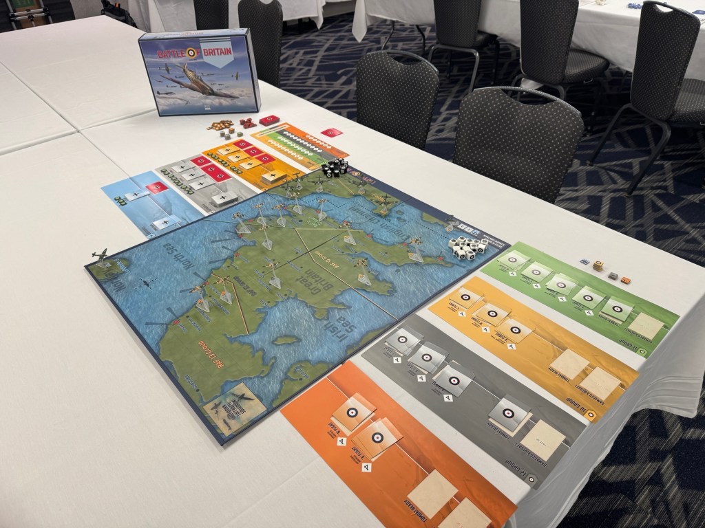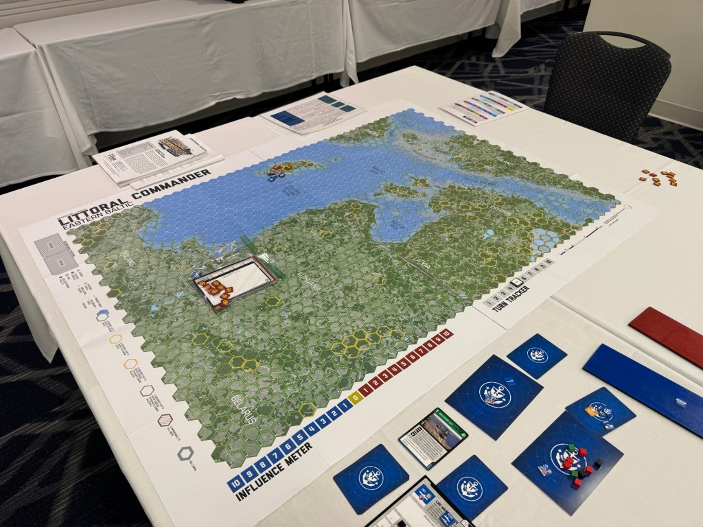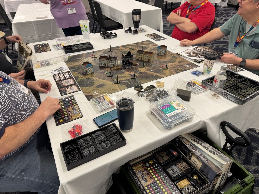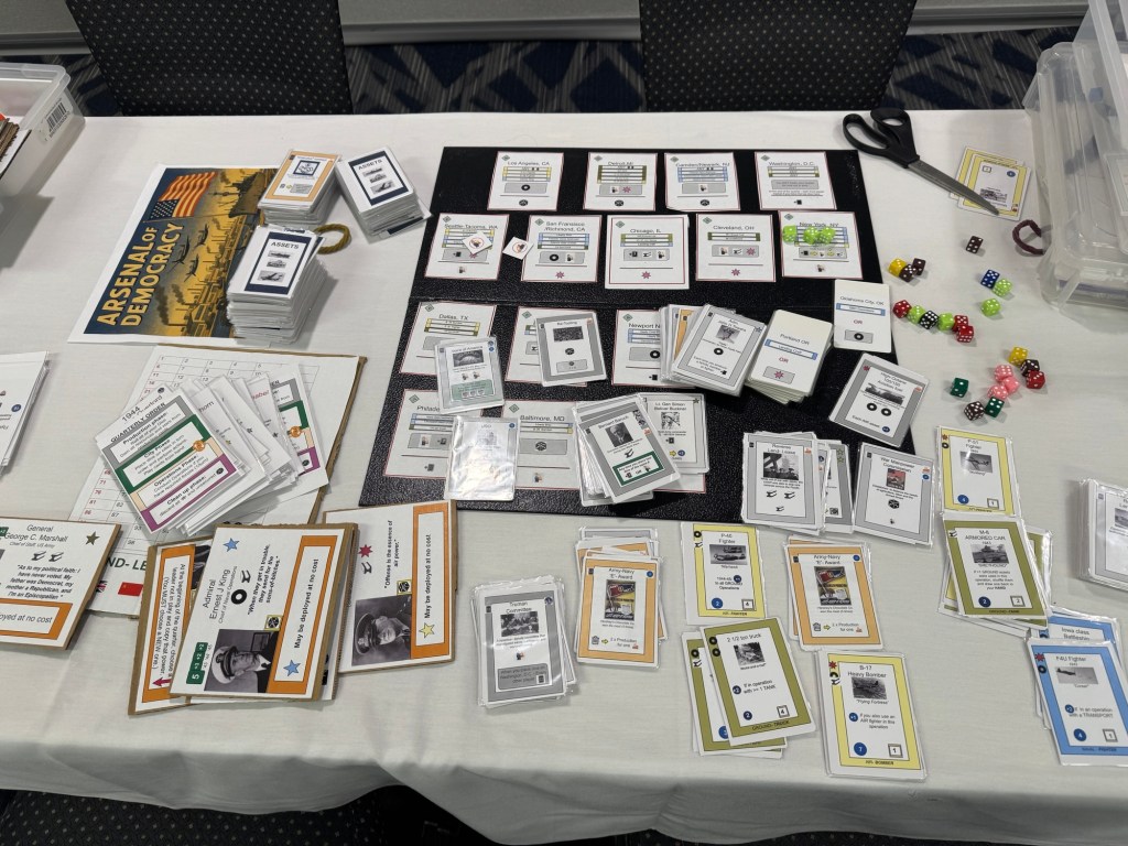 Day 2 dawned early and we were out the door by 7:45am for breakfast and made it to the War Room around 8:30am where we finished up our game of Blind Swords Volume 12: Gettysburg: The First Day from Revolution Games. We should a video review and then I walked around the War Room to see all the games that people were playing. I saw Battle Britain from PSC Games, which is a fun beer and pretzels air war game with cool little plastic minis, Littoral Commander: The Baltic from The Dietz Foundation, Company of Heroes: The Board Game from Bad Crow Games, which is a fun and lite miniatures based wargame based on the successful video game franchise, and a new and interesting looking prototype game called Arsenal of Democracy.