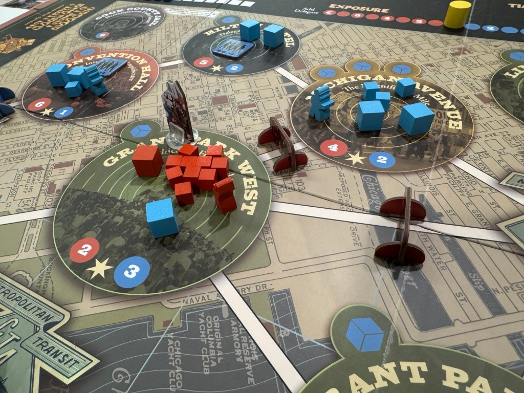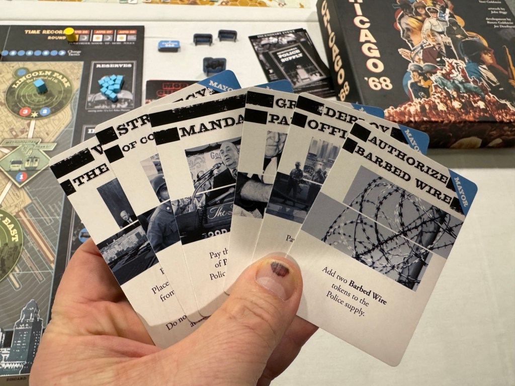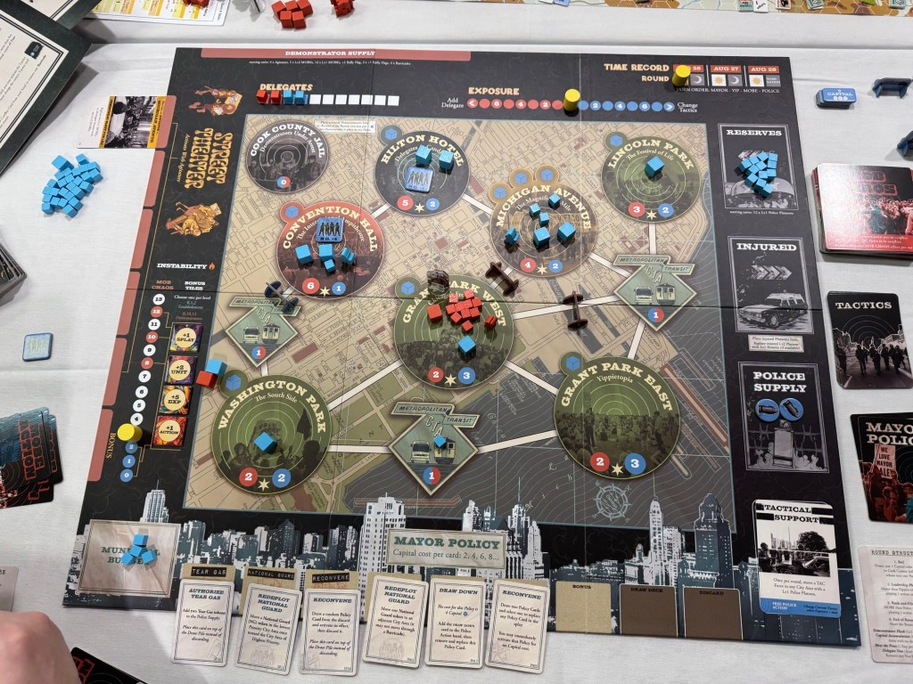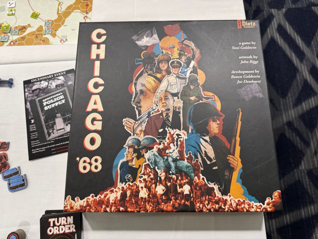 After lunch, we broke out Chicago ‘68 from The Dietz Foundation. Chicago ’68 pits revolutionary spectacle against civil order at the Democratic National Convention riots of 1968. Players take the role of either the Establishment, consisting of the Chicago PD and Mayor Daley, or the Demonstrators, including the Yippies and MOBE, and is a fast-paced game of street battles and political maneuvers.