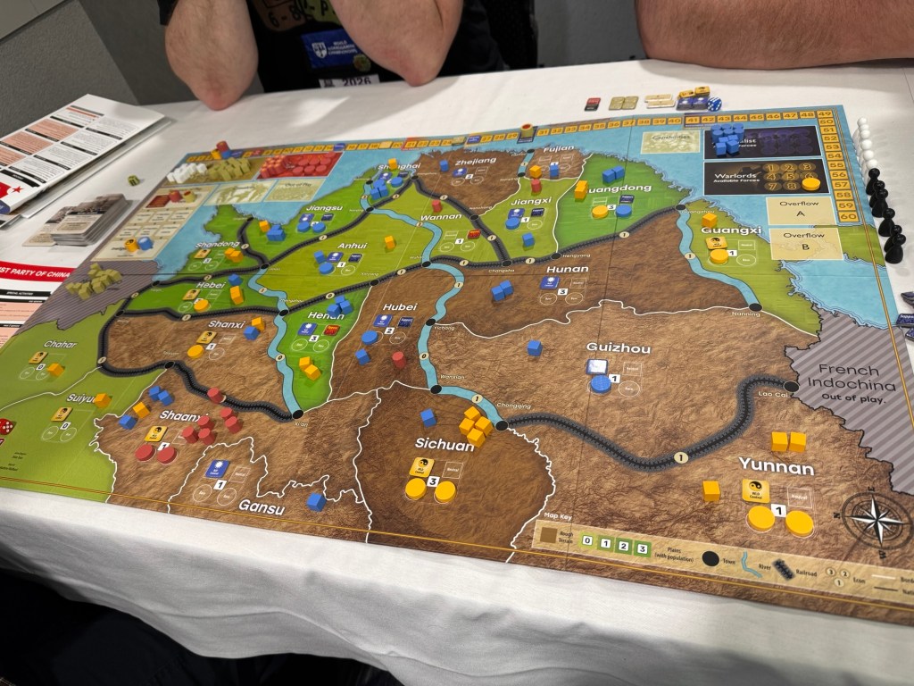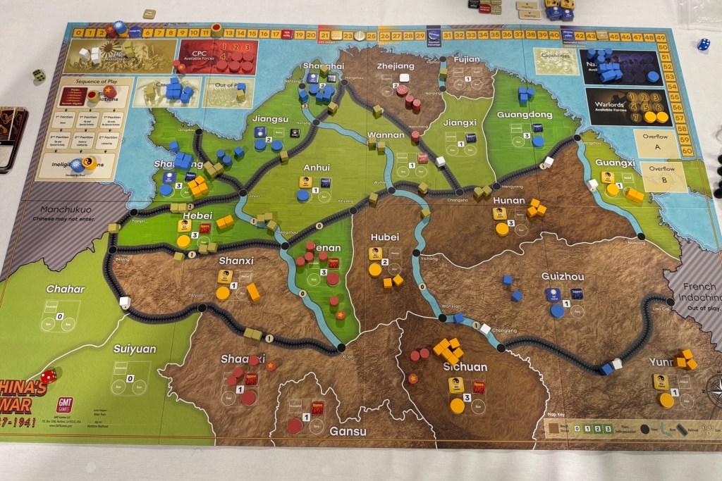 Our final game of the evening was the long anticipated China’s War: 1937-1941 from GMT Games, which is volume 13 in the COIN Series. China’s War examines the first five years of the conflict, when China stood alone against the Japanese Empire. Each player takes the role of a Faction seeking to attack or defend the Republic of China: the aggressive Japanese, the harried Government (represented by the Guomindang party), the rebellious Chinese Communist Party, or the unruly, fractious Warlords who are obedient when convenient but have their eye on gaining state power. Using military, political, and economic actions and exploiting various events, players build and maneuver forces to influence or control the population, extract resources, or otherwise achieve their Faction’s aims. A deck of cards regulates turn order, events, victory checks, and other processes. The rules can run non-player Factions, enabling solitaire, 2-player, or multi-player games.