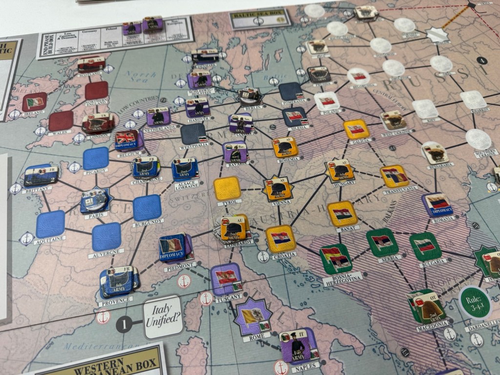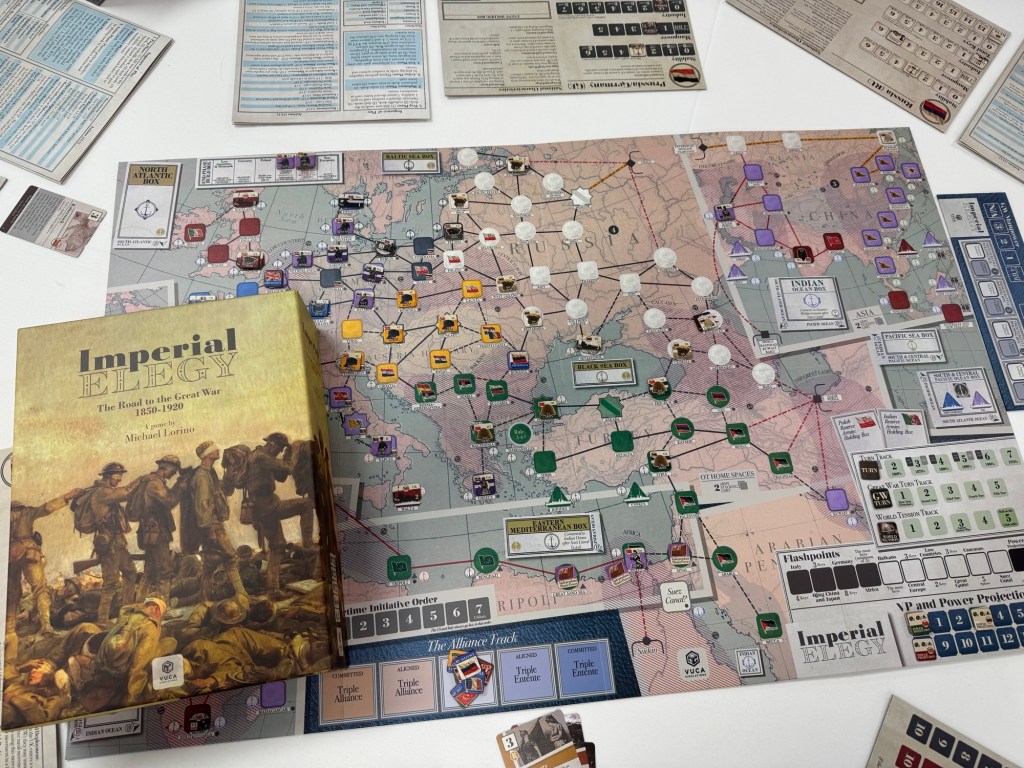 The day started with our first play of a brand new game called Imperial Elegy: The Road to the Great War 1850-1920 from VUCA Simulations. Imperial Elegy is a card driven game that blends diplomacy, warfare, and statecraft and feels a bit akin to games like Here I Stand and Virgin Queen from GMT Games. Grand scale sweeping epics that play multiplayers and take a day to play. Players play as 1 of 6 unique major powers in the game including Germany/Prussia, the United Kingdom, France, Austria-Hungary, Russia and the Ottoman Empire.