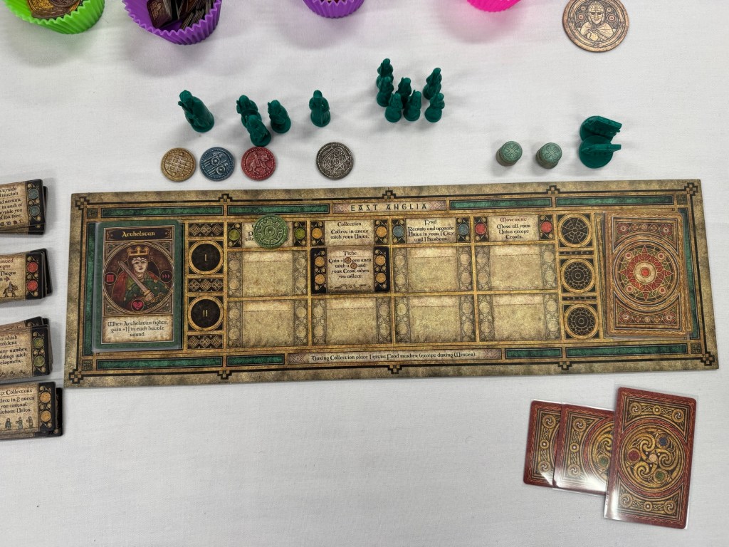 Bretwalda attempts to do what Civ Builders do but do it in a novel and different way…and also finds a way to incentivize combat, which was really a breath of fresh air for me. Bretwalda from PHALANX is a game for 1-4 players that plays in around 2 1/2 hours. Each player takes charge of one of the kingdoms of medieval England, including Northumbria, Mercia, Wessex and East Anglea, and each of these kingdoms has unique leaders and abilities. The goal is to be crowned the Bretwalda of England and victory will be achieved through a combination of controlling key areas with victory points, completing Chronicle cards in the form of hidden objectives and also focusing on building various buildings such as Abbeys.