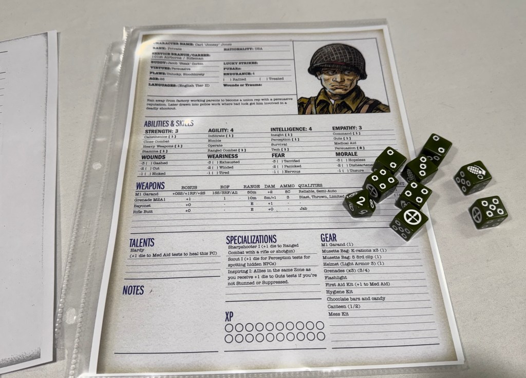 As an RPG players will have characters with various special focuses across 4 abilities including Strength, Agility, Intelligence and Empathy. Each time a skill is to the checked you find the matching ability and roll that number of six sided dice looking fur 6’s which mean success. If multiple successes are rolled you can earn special tokens called Lucky Strikes that can be saved and used as successes on future rolls. The players will have to decide if they roll their dice again and will remove any 1’s from the pool and roll the remaining dice again. If they fail this time though the GM will gain a FUBAR token that can be used to cause a failure on a rolled success in the future. This really created some cinematic moments and was a very interesting way to handle a check.