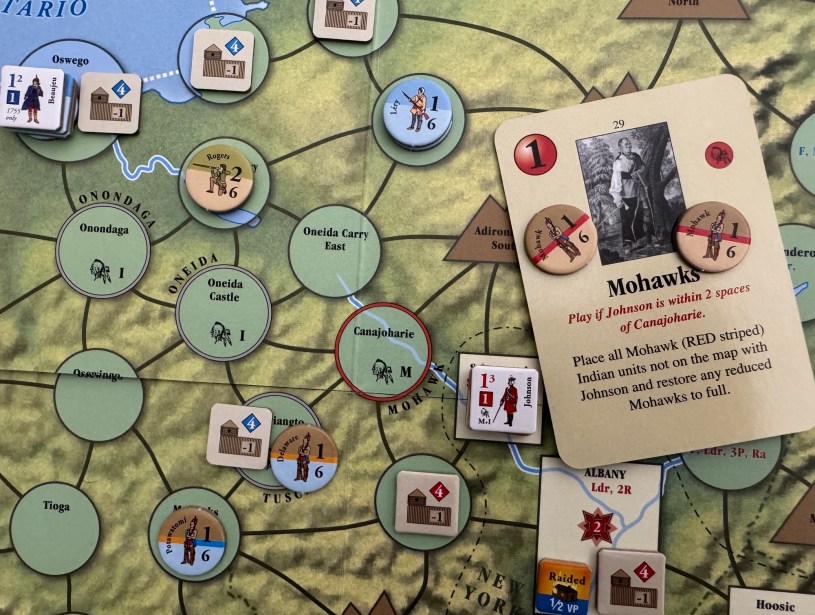 In this entry, we will take a look at the British card Mohawks. Mohawks is one of those cards that has a pre-requisite qualifying condition to play the card. In this case, the qualifier is that the leader Johnson must be located on the board within 2 spaces of Canajoharie, which was a Mohawk village located in upstate New York. As long as he is within the required 2 spaces, the card can be played to bring out onto the board the Red striped Mohawk Indian units. These must be placed with Johnson and the other added benefit is that any reduced Mohawks on the board can be flipped to their full side. These pro-British units can only be recruited by the British player and their arrival in New York can be a huge boon to the British as the French and their Indian allies will be raiding the villages and settlements up and down the frontier regularly during the game as one of their most dependable sources of Victory Points. These Mohawk allies can spread out around the area and intercept incoming raids before they can occur. Remember that Indian allies in Wilderness War are not powerful combat units and are best used to raid and prevent other tribes from raiding.