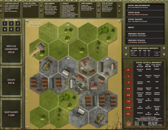 Each of your Campaigns involve both operational and tactical decisions. At the start of a Campaign, you select the Units and Commanders to make up your force. During each Week of the Campaign, you decide which Enemy Battalions to attack, which of your forces to allocate, and then resolve each Battle using the Tactical Battlefield. Your Commanders gain Experience with every Battle, but they also suffer Stress. Each Week you must decide how hard to push your men to achieve Victory. T-34 Leader is a great game for both experienced strategy gamers, as well as new players. Each Campaign takes around 30 minutes to set-up, and each Battle can be resolved in 15 to 30 minutes.