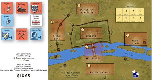 If you are interested in The Maid Ascendant: The Siege of Orleans, October 1428-May 1429, you can order a copy for $16.95 from the High Flying Dice Games website at the following link: https://www.hfdgames.com/maid.html