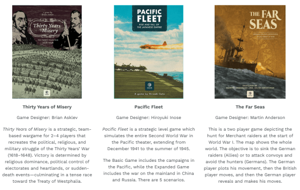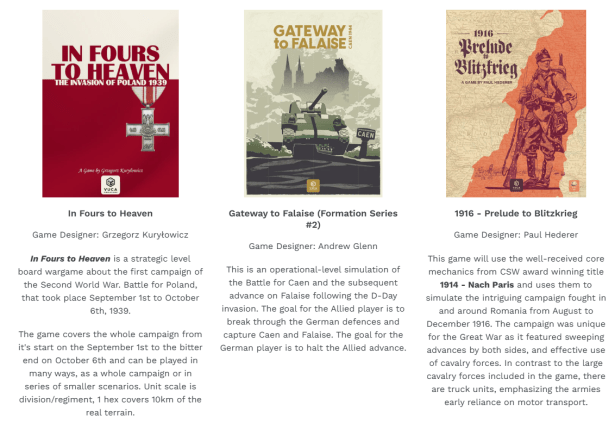 But I also want to point your attention to their In Development Section of their website to show you all of the great projects that they are currently working on. Here there are 7 different games listed with pictures of the beautiful covers and a description of the game itself. These titles include Thirty Years of Misery designed by Brian Asklev, Pacific Fleet designed Hiroyuki Inose, The Far Seas designed by Martin Anderson, In Fours to Heaven designed by Grzegorz Kuryłowicz, Gateway to Falaise designed by Andrew Glenn, 1916 – Prelude to Blitzkrieg designed by Paul Hederer and Saint-Lô – The Capital of Ruins designed by Clemm.