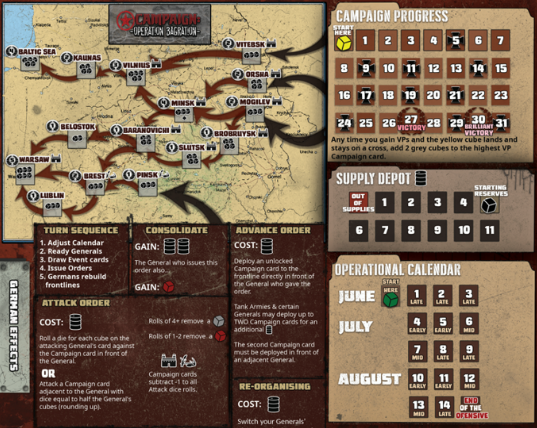 A few years ago, I played and very much enjoyed a cool little solitaire WWII card-driven game called Campaign: Fall Blau from Catastrophe Games and designer Martin Melbardis where the player attempted to breach the Soviet defenses on the East Front in the pivotal German summer campaign of 1942. The game system is very playable and simple, but has some strategic depth to it as the player has to make a lot of choices about what to go after, how to manage their scarce resources (fuel) and what generals to use to take advantage of their special abilities to amass enough VP to claim victory over the Soviet Union. They now have the counter punch of that game in a new entry in the series called Campaign: Operation Bagration and it is currently being offered on Kickstarter.