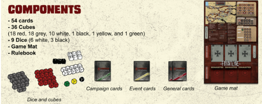 Martin: After using the Advance Order to bring an unlocked Campaign Card to the frontline in front of a General’s Card, that Campaign Card then immediately deploys a number of grey cubes (listed on the card) onto itself. The card is now available to be attacked using the Attack Order. When you attack, you pay supplies then calculate the number of cubes on the attacking General’s Card and roll that many dice. You need rolls of 4+ to remove a single white (defense) or grey (German units) cube from the Campaign Card. Some Campaign Cards such as fortress cities (Festerplatz) or swamps reduce the attack dice by -1. Rolls of 1–2 result in your General losing a manpower cube (red cube). Once all German cubes are removed from the Campaign Card, it is considered captured and removed from the frontline, and you gain the Victory Points listed on the card. Capturing Campaign Cards also unlocks additional Campaign Cards.