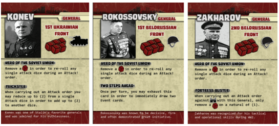 Martin: As mentioned, each General has the “Hero of the Soviet Union” special ability, which allows you to discard a red cube to re-roll a single die. This represents the Soviet ability to historically take massive casualties and still push on. On top of that, each General also has a unique ability reflecting their historical traits. For example, General Bagramyan is an offensive-minded General, while Rokossovsky was known to always plan two steps ahead and this is represented by his ability to draw extra cards from the Event Deck.