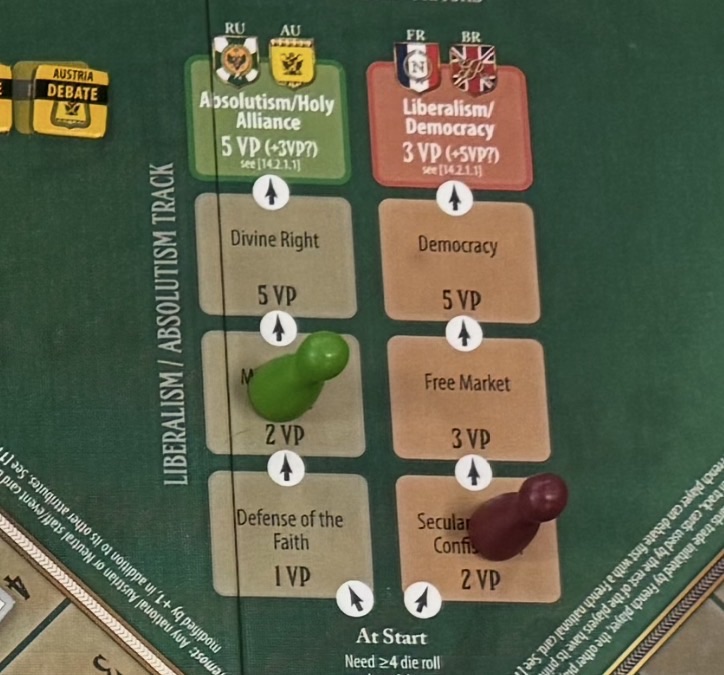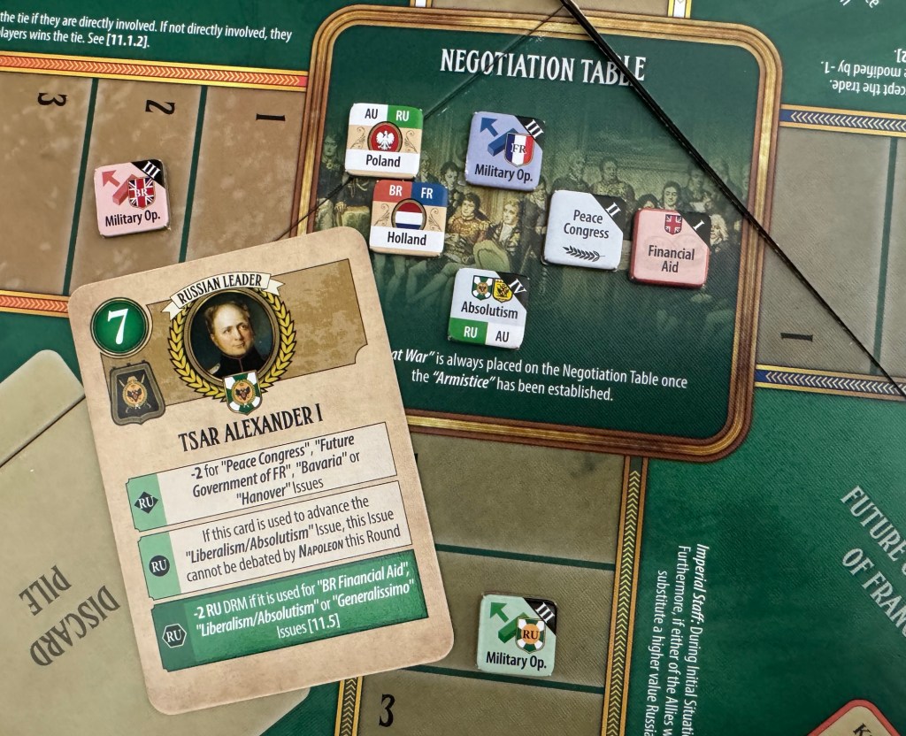 The other part of this ability is that if Tsar Alexander I is used to move the Liberalism/Absolutism Issue then Napoleon cannot be used to Debate that movement. I would say that this is not an issue though as typically the France player will be using Napoleon on the battlefield for his DRM abilities.