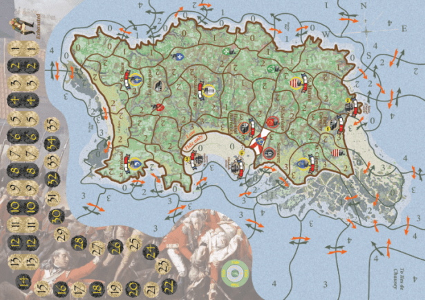 Peregrine: These are “difficulty” ratings – the lower the number the more difficult it is going to be to move your forces out of an area. You will notice that the Jersey map has some land and sea spaces that are rated “0” – we built some special rules in for those!