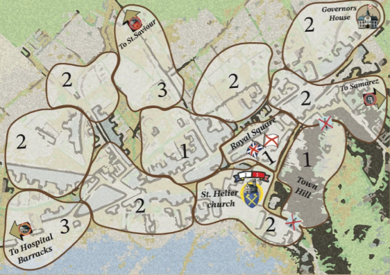 Peregrine: It covers the whole island. Jersey is not a big place, approximately 45 square miles, so this was not difficult. We also have a separate “break-out” map showing key locations in the capital, St Helier, which will be the focus of the fighting in 1781.