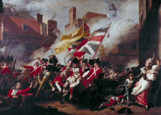 Also, the picture on the box cover and superimposed behind the map & the player aids is contemporary too – being the painting The Death of Major Pierson by John Singleton Copley which was created in 1782-3 and now hangs in the Tate Britain gallery in London.